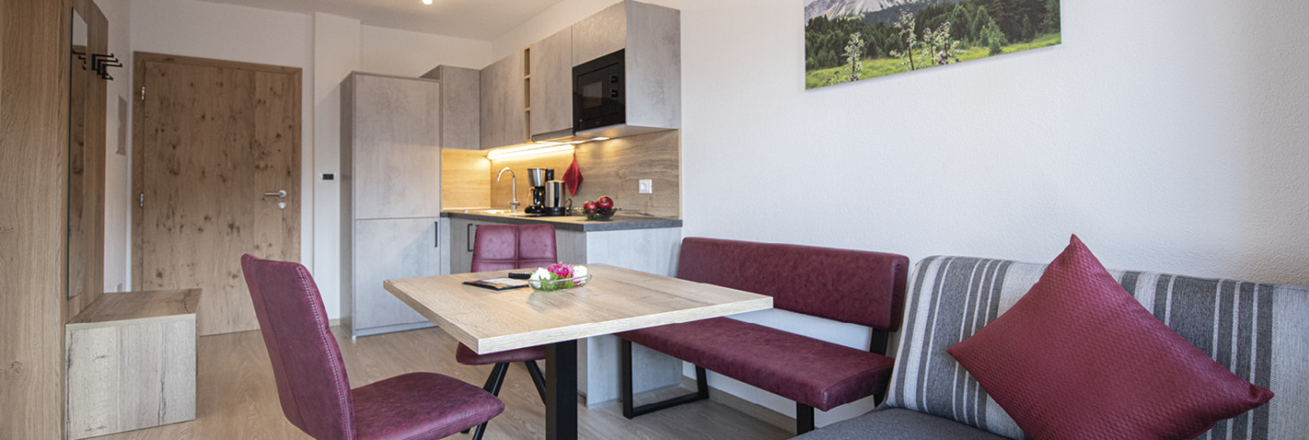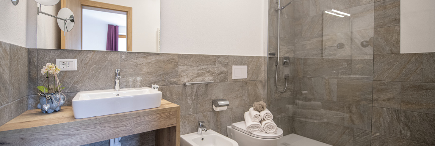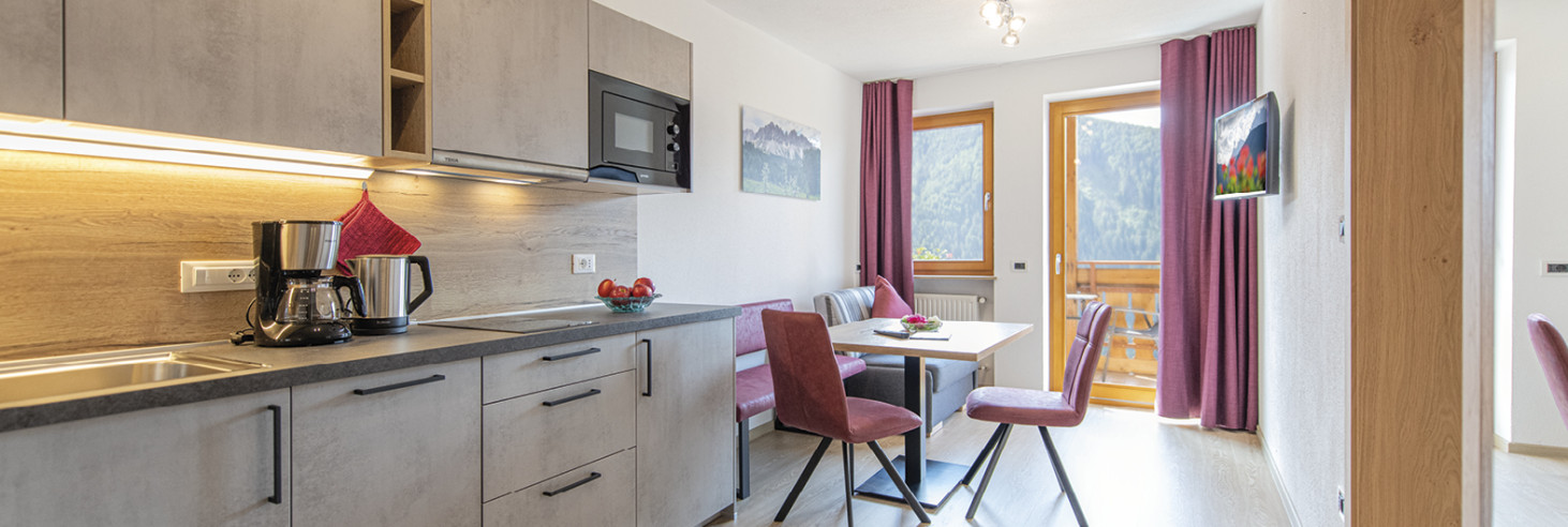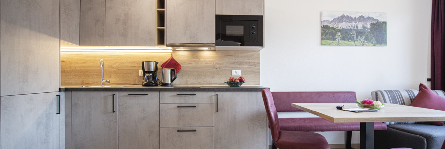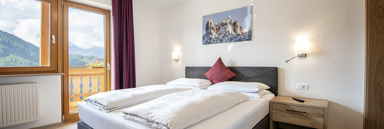 Welcoming apartment with an impressive view of the Dolomites: bedroom with box-spring double bed, 2 SAT-TV, safe, WIFI, bathroom with shower/WC/bidet & hairdryer, living room with inviting dining area, fully equipped kitchen (induction cooktop, fridge, microwave, dishwasher, coffee machine, kettle), couch; south side balcony approx. 10 m² (with table & chairs). Perfect for a romantic time out as a couple.