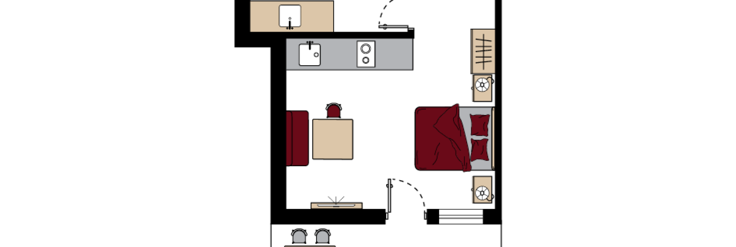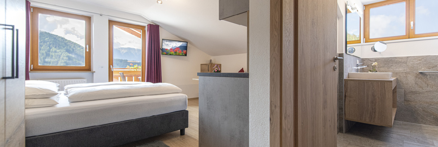 Accogliente monolocale con vista sorprendente sulle Dolomiti: ideale per una coppia o una persona sola, dotato di letto matrimoniale boxspring, TV sat, cassaforte, WIFI, comoda zona pranzo, angolo cottura completamente attrezzato (piano cottura ad induzione, frigorifero, forno a microonde, macchina caffè, bollitore d’acqua, senza lavastoviglie), bagno con doccia/WC/bidet & asciugacapelli, balcone lato sud ca. 8 m² (con tavolo & sedie).