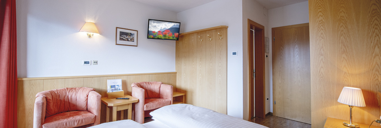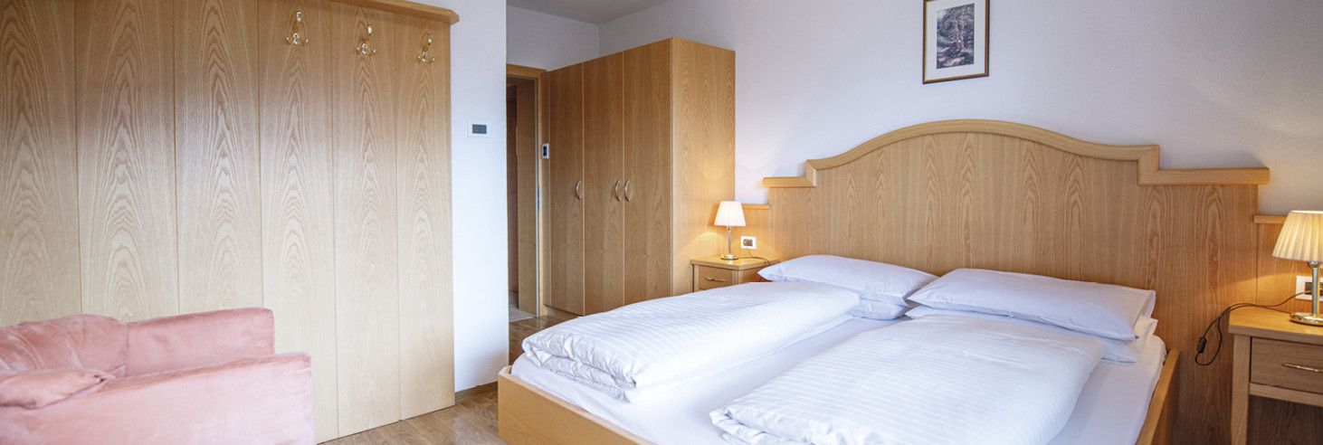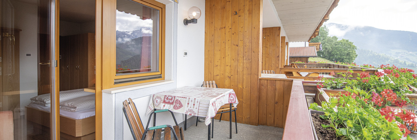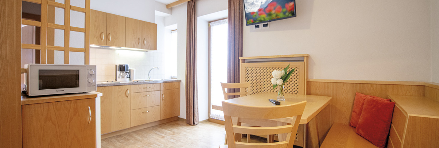 Appartamento tradizionale con vista estesa sulle montagne per una vacanza in due o in tre: camera con letto matrimoniale, cassaforte, piccolo angolo soggiorno, bagno: doccia/WC & asciugacapelli (senza bidet), soggiorno con zona pranzo, angolo cottura completamente attrezzata (piano cottura, frigorifero, macchina da caffè, bollitore d’acqua, forno a microonde, senza lavastoviglie), 2 SAT-TV, WIFI, divano estrabile per 1 persona, terrazza lato ovest ca. 12 m² e balcone lato sud ca. 6 m² (con tavolo & sedie).